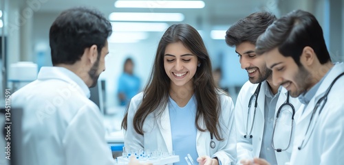 A diverse group of medical professionals collaborating in a laboratory, showcasing teamwork and innovation in healthcare research