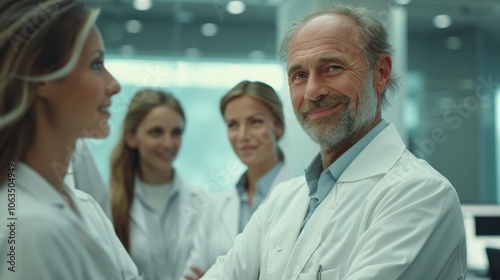 A diverse group of professionals in lab coats smile confidently in a modern, well-lit laboratory setting.