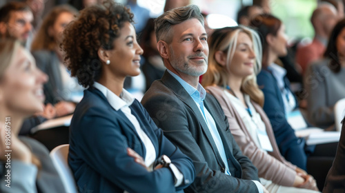 A diverse group of professionals sit attentively in a conference room, their expressions reflective of focus and engagement in the material presented.