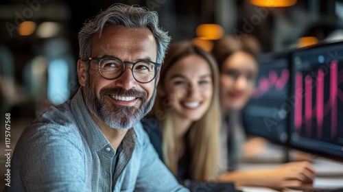 A diverse group of professionals smiling in an office setting with computer screens displaying data.