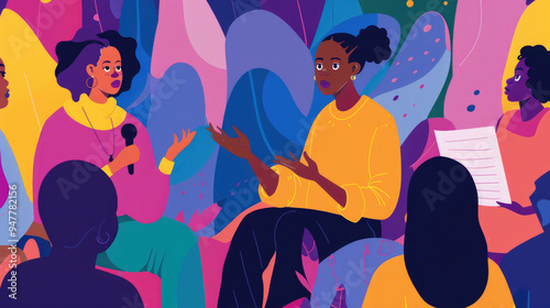 A diverse group of women engages in a lively discussion, sharing ideas in an inspiring and artistic environment