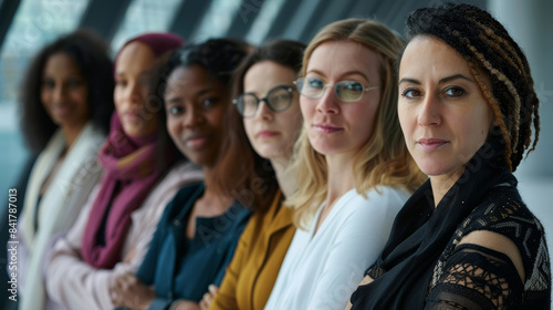 A diverse group of women standing together, each with distinct expressions and styles, symbolizing unity and empowerment.