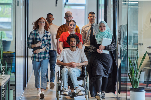 A diverse group of young business people walking a corridor in the glass-enclosed office of a modern startup, including a person in a wheelchair and a woman wearing a hijab, showing a dynamic mix of