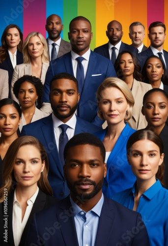a diverse group portrait of professional-looking people in business attire against a colorful striped background. The image shows men and women of various ethnicities, with some wearing suits and othe