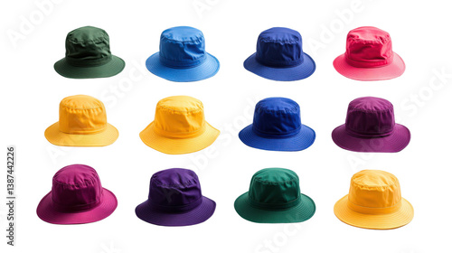 A diverse set of bucket hats in various bright colors Transparent background, PNG file, showcasing the casual yet stylish design of each hat.