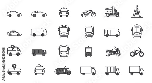 A diverse set of minimalist transportation icons, including cars, buses, trucks, and trains, in a simple line art style with grey accents.