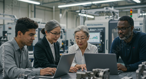A diverse team of engineers collaborates on a project in a modern factory, deeply engrossed in their laptops and showing focused determination in a bright, clean workspace.