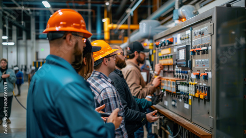 A diverse team of factory workers operates electrical control panels in an industrial setting.