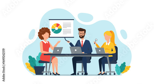 A diverse team of professionals collaborates during a productive business meeting, analyzing data presented on a screen to strategize future growth.