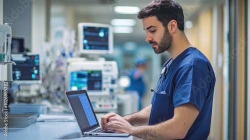 A doctor in scrubs working at a laptop in a hospital break room, reviewing patient information during a busy shift, with medical equipment visible in the background