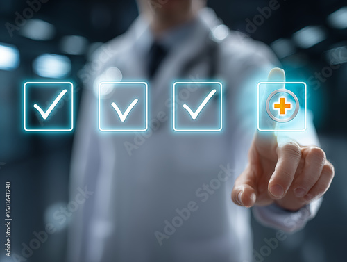A doctor in white coat touching a futuristic digital interface with check marks and medical cross icon, representing healthcare technology, diagnosis checklist, and medical innovation
