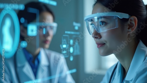 A doctor using augmented reality (AR) glasses to diagnose a patient