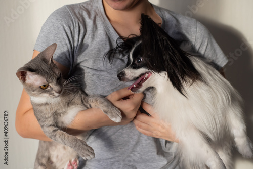 A dog and a cat are fighting in the hands of a young female owner. Papillon and Brush Sphinx are playing