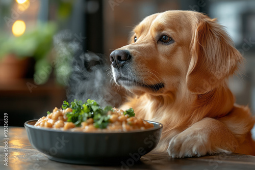 A dog enjoying a bowl of homemade stew, with steam rising and a satisfied, relaxed expression,