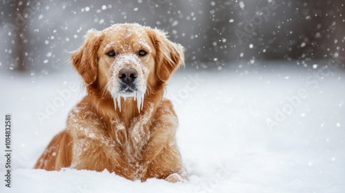 A dog is laying in the snow with its nose in the snow