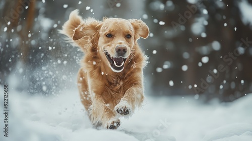 A dog playing in the snow during winter. The dog is energetically bounding through the snow, with snowflakes flying around and a joyful expression on its face.