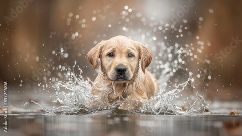 A dog runs through a shallow body of water, creating splashing water droplets around its body