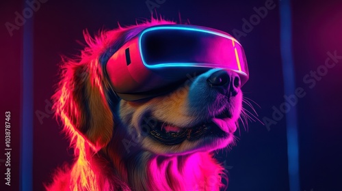 A dog wearing futuristic VR goggles in a vibrant, colorful setting.