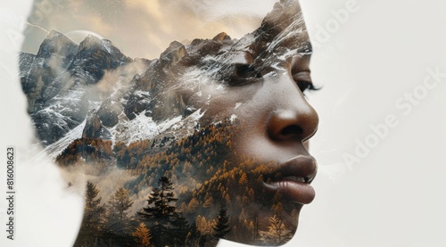 A double exposure photography of an African American man's face and the top part of alps mountain range, with snowcapped peaks, in muted earth tones against a white background.
