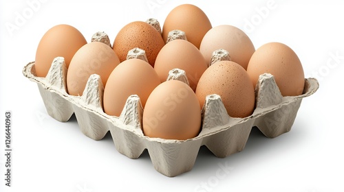 A Dozen Brown Eggs in Cardboard Carton Against White Background