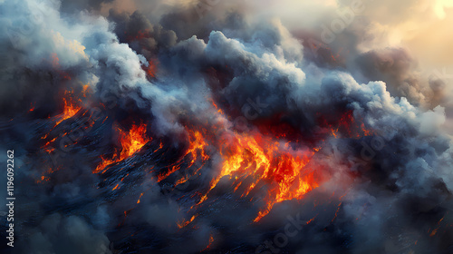 A dramatic aerial shot captures a raging wildfire. intense flames and billowing black smoke engulf a landscape, creating a fiery, smoky scene. Frostflare. Illustration