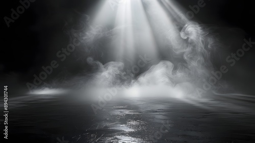 A dramatic and atmospheric scene featuring ethereal beams of light piercing through swirling smoke in a dark environment, creating a sense of mystery and intrigue.