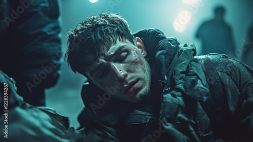 A dramatic and intense scene capturing a young man's expression of exhaustion and despair in a dimly lit, possibly dire environment, conveying deep emotions.