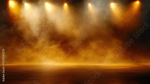 A dramatic background featuring a warm, smoky atmosphere illuminated by soft spotlights, creating an ideal setting for product display or theatrical presentations.