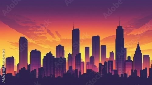 A dramatic city skyline silhouette at dusk, with dark outlines of skyscrapers against a colorful sky transitioning from orange to purple.