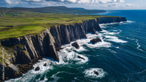 A dramatic coastal scene from above with waves crashing against rugged cliffs.