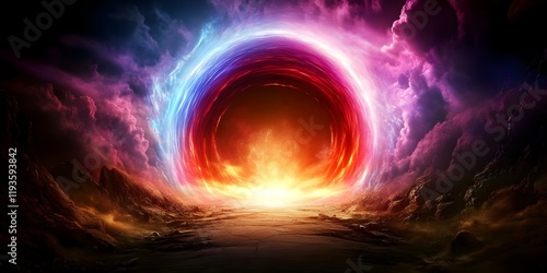 A dramatic cosmic scene featuring a glowing portal surrounded by vibrant colors and swirling clouds. Concept Dramatic Cosmic Scene, Glowing Portal, Vibrant Colors, Swirling Clouds