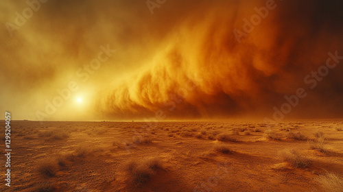 A dramatic desert sandstorm with swirling particles under a blazing sun creates a captivating golden haze, enveloping the landscape in an intense display of nature's power and energy