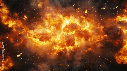 A dramatic explosion with flames and smoke, depicting a powerful and chaotic scene.