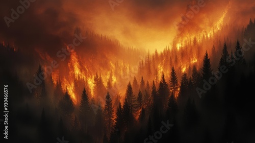 A dramatic forest fire illuminates the landscape with intense orange and red hues, evoking a sense of danger and urgency. The towering trees stand silhouetted against the flames.