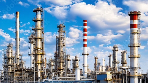 A dramatic industrial landscape showing the towering chimneys and pipework of an oil refinery complex under a cloudy sky The scene conveys the scale and power of the energy production facilities