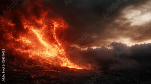 A dramatic landscape captures a molten lava flow under stormy skies, evoking powerful emotions of awe and danger, illustrating nature's fierce power and unpredictability.