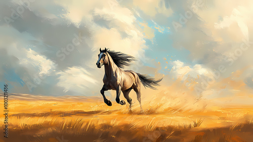 A dramatic oil painting of a wild horse running free across a windswept plain, with dynamic brushstrokes capturing the power and grace of the animal. Wind-swept Plains. Illustration