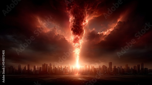 A dramatic post apocalyptic cityscape engulfed in flames and surrounded by an ominous glowing sky filled with dark clouds and bursts of energy
