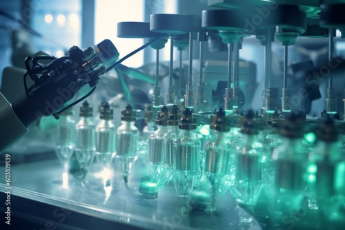 A dramatic shot of robotic arms in action, handling vials and ensuring the accuracy and speed of the production process. Generative Ai