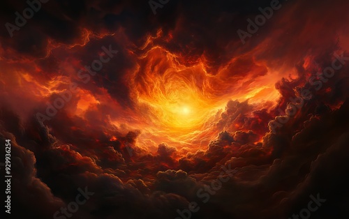 A dramatic sunset with vibrant orange and red hues illuminating swirling clouds in a captivating celestial scene.