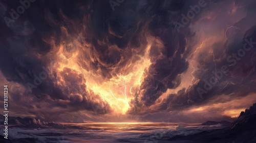 A dramatic thunderstorm brewing on the horizon, with towering cumulonimbus clouds surrounded by dark, swirling striations and streaks of lightning illuminating the sky.