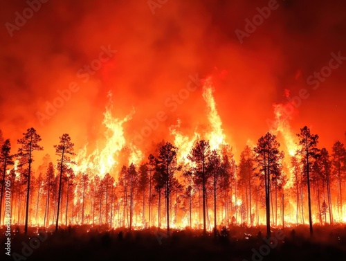 A dramatic view of a forest fire engulfing trees in bright flames, showcasing the power of nature and the threat of wildfire.