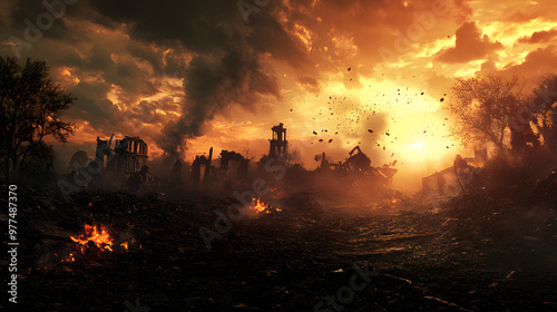 A dramatic war battle scene with soldiers in trenches, explosions lighting up the sky, smoke billowing, and chaos unfolding as troops clash amidst debris and gunfire