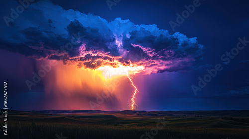 A dramatic, wide-angle scene of a powerful thunderbolt striking from a large, glowing purple cloud in a dark, stormy sky.