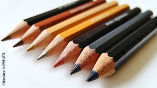 A drawing pencil set showcasing various lead grades, lined up in gradient order on a white surface,