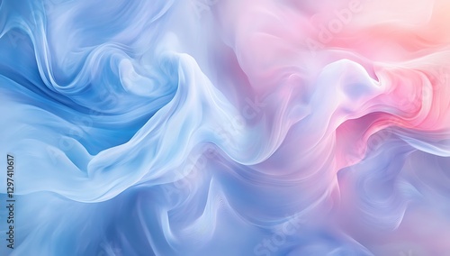 A dreamy abstract background with swirling fluid shapes in pastel shades of blue, pink, and white, evoking a soft, ethereal atmosphere perfect for creative designs.