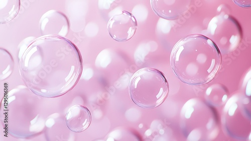 A dreamy collection of pink bubbles rising slowly against a soft light background, providing plenty of room for design or text overlays.