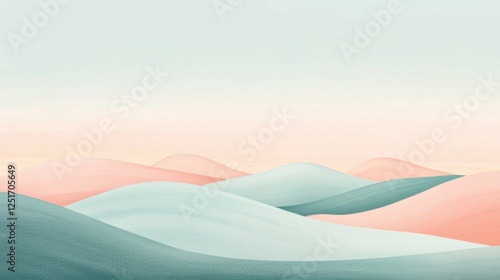 A dreamy pastel landscape with rolling hills in soft hues of mint green, sky blue, and warm peach, creating a tranquil and harmonious scene