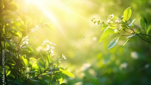 A dreamy scene of lush greenery, illuminated by warm sun rays, with delicate buds preparing to bloom in a peaceful garden