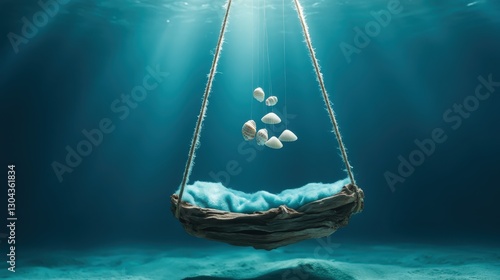 A dreamy swing adorned with seashells floats serenely underwater, suspended in tranquil blues, evoking a sense of calm and wonder in this enchanting aquatic scene.